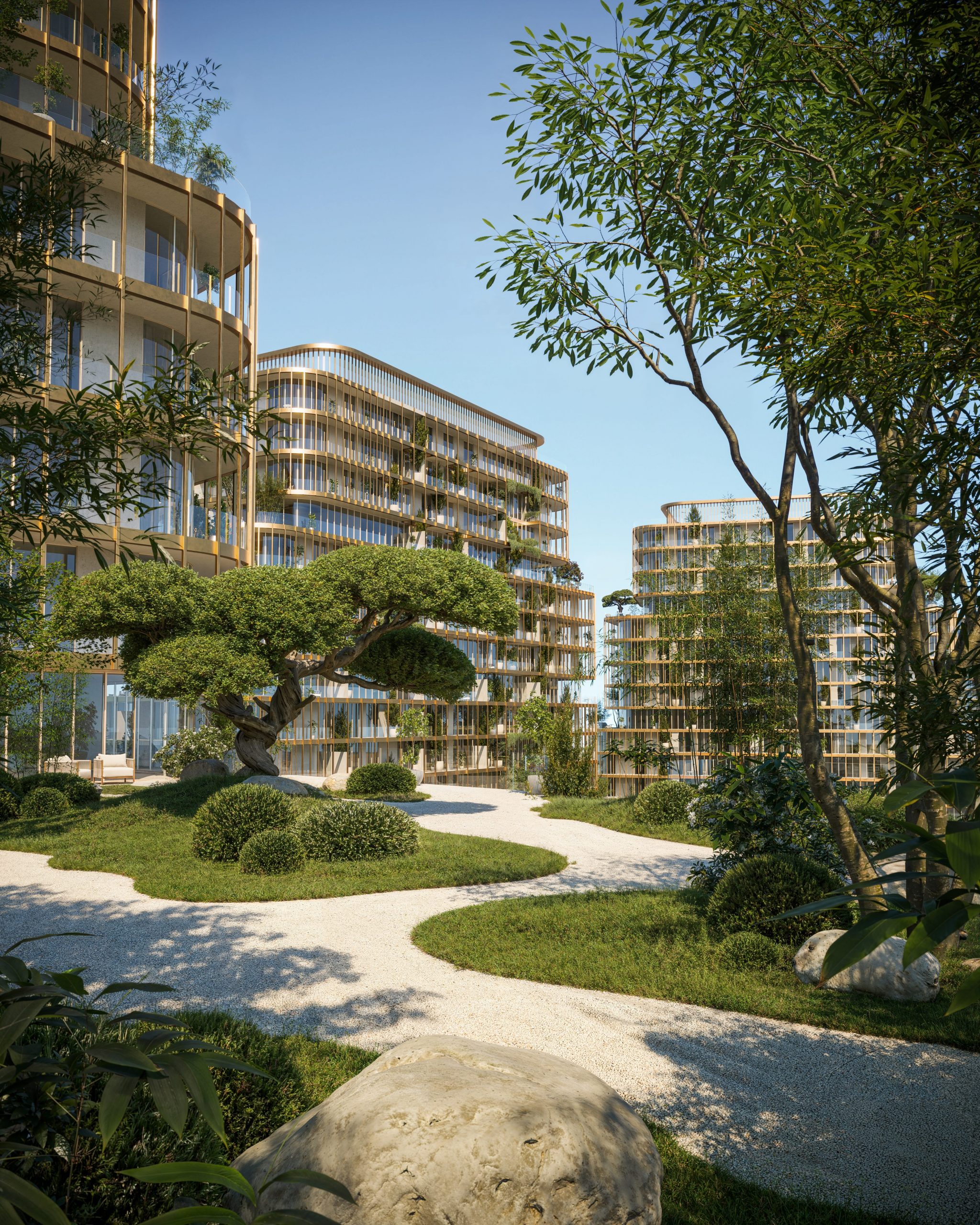 Design at HADO follows purity, proportion, and a quiet Japanese discipline. Open forms and terraced volumes create a natural rhythm, shifting gently with the light. Rising across 21 levels, the three towers emerge from a landscape inspired by the flowing coastline. A shared base links gardens, courtyards, and reflection pools, anchoring the architecture in nature while opening it to the horizon. Oriented to frame the sea, cove, skyline, and greenery, the design evokes a calm sense of movement, capturing the essence of island living.